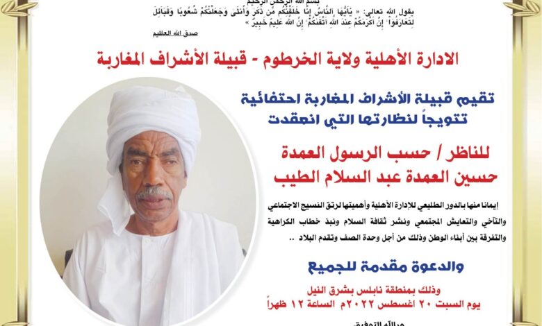 أكدت قبيلة الأشراف المغاربة إقامة احتفال تنصيب الناظر حسب الرسول العمدة حسين في موعدها السبت المقبل ، ونفى المغاربة في…