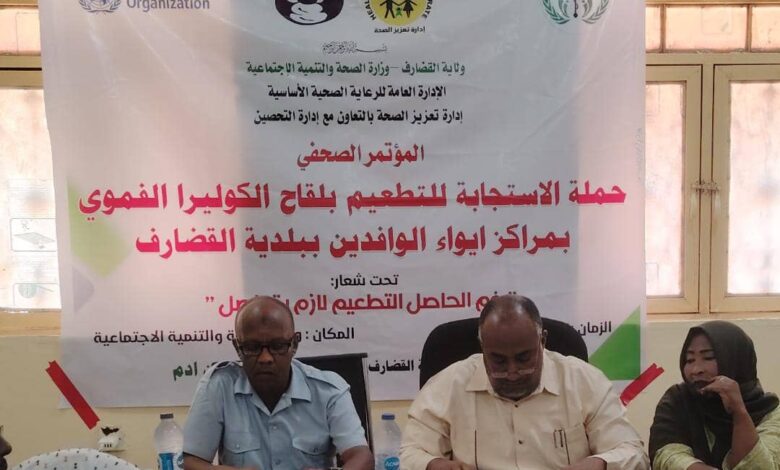 أعلنت وزارة الصحة والتنمية الإجتماعية بولاية القضارف عن إكتمال كافة الترتيبات الفنية والإدارية لانطلاق حملة توزيع لقاح الكوليرا الفموي بمراكز الإيواء ببلدية القضارف في يوم السبت القادم 19 – وحتى – 26 من أكتوبر الجاري والتي تستهدف (169.962) شخصاً وبمشاركة أكثر من (170) تيم.