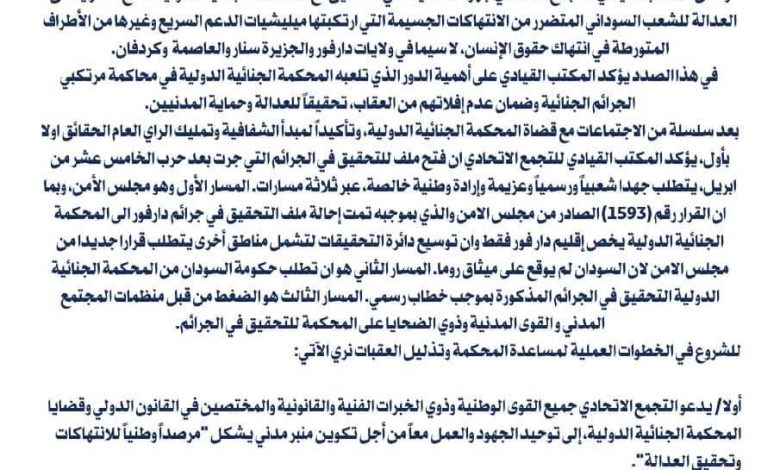 وحدد، الحزب في بيان، الخميس، ثلاث مسارات لذلك وهي عبر مجلس الأمن، أو ان تطلب حكومة السودان من المحكمة الجنائية الدولية التحقيق في الجرائم، والمسار الثالث هو الضغط من قبل منظمات المجتمع المدني و القوى المدنية وذوي الضحايا على المحكمة للتحقيق في الجرائم.