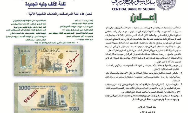 أعلن بنك السودان المركزي عن طرح ورقة نقدية جديدة من فئة الألف جنيه للتداول في الأيام القادمة..