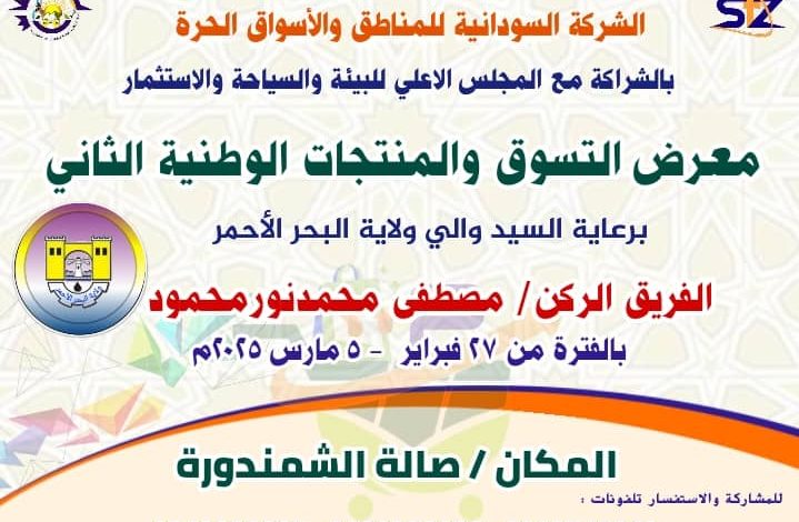 برعايه والي البحر الأحمر الفريق مصطفى محمد نور، الشركة السودانية للمناطق والأسواق الحرة بالشراكة مع المجلس الأعلى للبيئة والسياحة والاستثمار تنظم معرض التسوق والمنتجات الوطننة الثاني، في الفتره من 27-2 وحتى 5-3-2025م، وذلك بصالة الشمندورة بورتسودان..