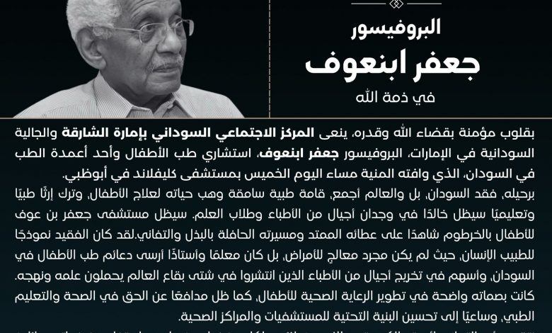 بقلوب مؤمنة بقضاء الله وقدره، ينعى المركز الاجتماعي السوداني بإمارة الشارقة والجالية السودانية في الإمارات، البروفيسور جعفر ابنعوف، استشاري طب الأطفال وأحد أعمدة الطب في السودان، الذي وافته المنية مساء اليوم الخميس بمستشفى كليفلاند في أبوظبي.