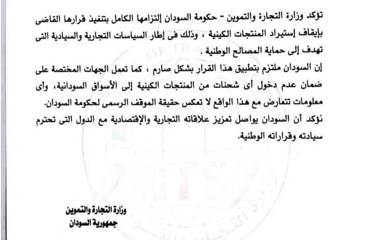 أكدت وزارة التجارة والتموين السودانية، التزامها الكامل بتنفيذ قرارها القاضي بإيقاف استيراد المنتجات الكينية.