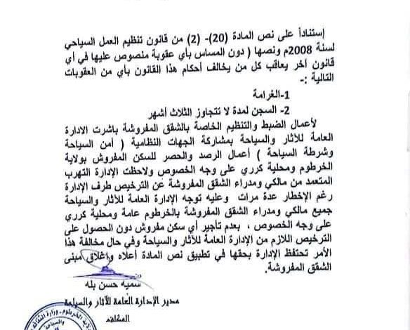 حذرت الإدارة العامة للسياحة والآثار بولاية الخرطوم مُلاك الشقق المفروشة بعدم تاجير اي سكن مفروش دون الحصول على ترخيص من الإدارة العامة للسياحة والآثار بالولاية.