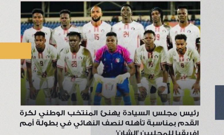 هنأ رئيس مجلس السيادة الانتقالي، عبدالفتاح البرهان، المنتخب السوداني لكرة القدم، بمناسبة تأهله إلى نصف نهائي بطولة أمم إفريقيا للمحليين “الشان”.