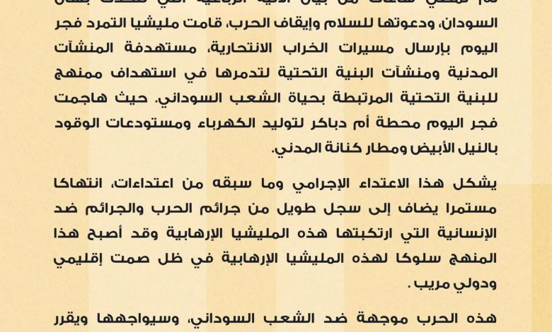 وذلك في استهداف ممنهج للبنية التحتية المرتبطة بحياة الشعب السوداني، وتابع : هذا الاعتداء الإجرامي وما سبقه من اعتداءات، تشكل انتهاكا مستمرا يضاف إلى سجل طويل من جرائم الحرب والجرائم ضد الإنسانية التي ارتكبتها هذه المليشيا في ظل صمت إقليمي ودولي مريب .