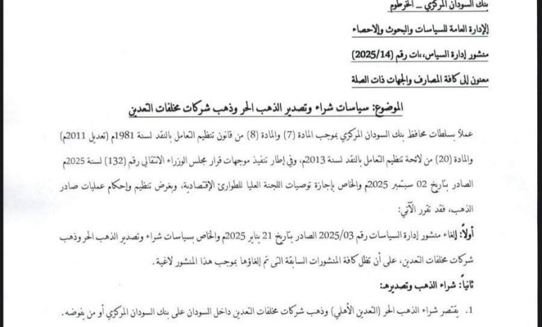 أعلن بنك السودان المركزي في منشور له عن اقتصار شراء الذهب الحر “التعدين الأهلي” وذهب شركات مخلفات التعدين عبره فقط، وفقاً لأسعار البورصة العالمية وسعر السوق السائد.