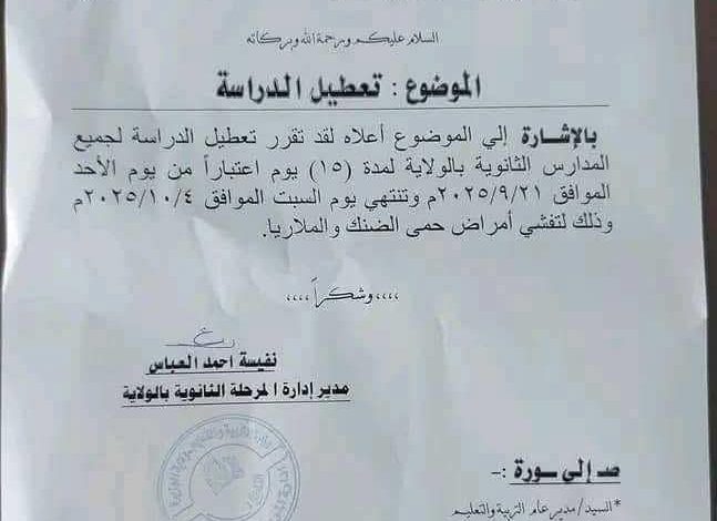 أعلنت الاستاذه نفسيه احمد العباس مدير المرحلة الثانويه بولاية الجزيره عن تعطيل الدراسه بجميع المدارس الثانوية لمدة خمسة عشر يوما اعتباراً من يوم الأحد 2025/9/21 وتنتهي يوم السبت 2025/10/4 بسبب تفشي حمى الضنك والملاريا .