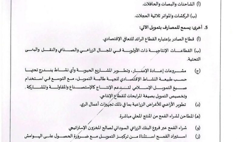 وحدد البنك في منشور موجبات منح التمويل المصرفي للعام 2026م، شرط تحسين وصيانة المأوى في حدود مبلغ التمويل الصغير، على أن يكون المأوى مملوكاً للعميل طالب التمويل، مصانع الأدوية وخطوط الإنتاج وشراء المعدات والتجهيزات الخاصة بصناعة الدواء المنتج محلياً، الصوامع والمخازن والمحالج في مناطق الإنتاج، والسماح بالتجارة الداخلية عدا شراء الحبوب الزيتية لأغراض التجارة الداخلية.