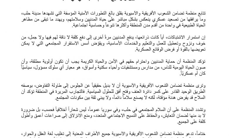 منظمة تضامن الشعوب الأفريقية الآسيوية تحذر من تداعيات التصعيد الأمني في حلب وتدعو لحماية المدنيين