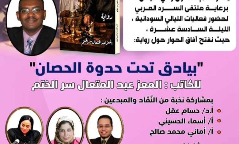 ينظم صالون وادي النيل ضمن فعاليات ملتقى السرد العربي، أمسية أدبية لمناقشة رواية “بيادق تحت حدوة الحصان” للكاتب المعز عبد المتعال سر الختم، يوم غد الخميس الموافق الثاني من شهر أبريل الجاري.