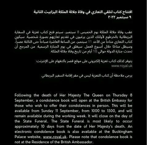 أعلنت السفارة البريطانية بالخرطوم أنه سوف يتم فتح كتاب تعزية في مقر السفارة لتلقي التعازي في وفاة جلالة الملكة اليزابيث اعتبارا من الأحد 11 سبتمبر، من الساعة العاشرة صباحا حتى الثالثة عصراً. وقالت أن الكتاب سيظل متاحًا خلال أسبوع العمل وسيغلق يوم الجنازة الرسمية.
