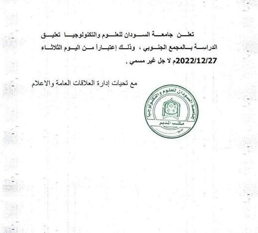 أصدرت جامعة السودان قرارا قضى بتعليق الدراسة بمجمع كليات الهندسة الجنوب الى اجل غير مسمى اعتبارا من اليوم الثلاثاء ، ويأتي تعليق الدراسة على خلفية واحتجاجات قادها طلاب الجنوبي اعتراضا على الرسوم الدراسية .