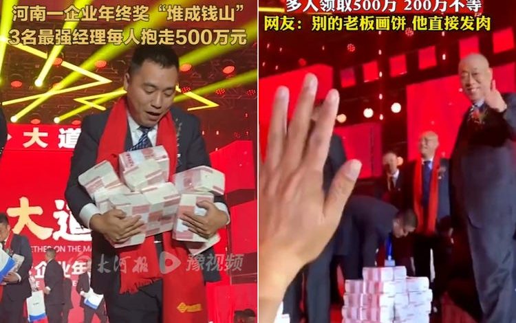 وفي 17 يناير الماضي، أصدرت شركة Henan Mine مقاطع فيديو لموظفيها وهم يسيرون على خشبة المسرح لجمع مكافآت نهاية العام من جبل من النقود يبلغ ارتفاعه 6.5 أقدام ويخرجون بأذرعهم المليئة بالفواتير،وتم تقديم مليون يوان على الأقل لأكثر من 30 موظفاً آخر (حوالي 150 ألف دولار أمريكي).
