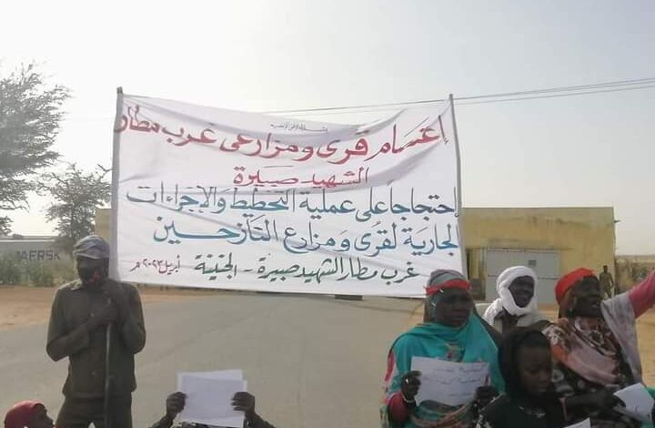 أغلق مواطنين صباح اليوم الأربعاء مطار الشهيد صبيرة مدينة الجنينة رفضا لعمليات تخطيط أراضي زراعية للنازحين تقع بالقرب من المطار، ونفذ أهالي المناطق المجاوره للمطار اعتصام مفتوح.