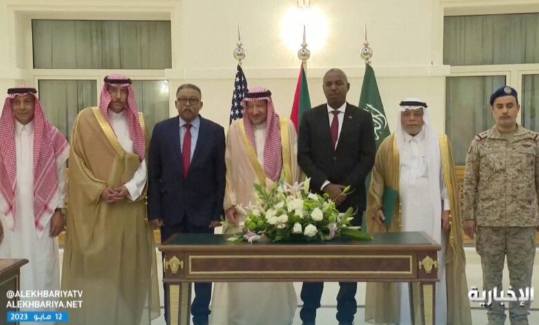 Officials stand for pictures after Sudan's army and rival paramilitary rapid support force signed a declaration, that signifies their commitment to protect the civilians of Sudan but not to a ceasefire, in Jeddah, Saudi Arabia, May 11, 2023. Al Ekhbariya/Handout via REUTERS THIS IMAGE HAS BEEN SUPPLIED BY A THIRD PARTY. NO RESALES. NO ARCHIVES. MUST NOT OBSCURE LOGO.