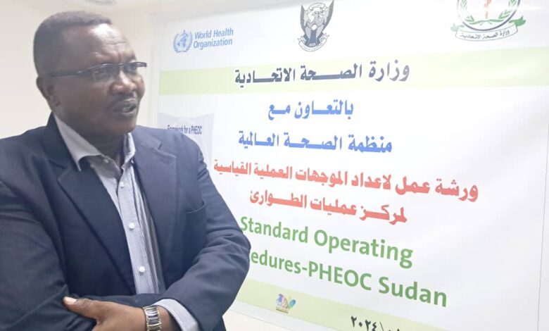 واكد مدير الإدارة العامة للطوارئ الصحية ومكافحة الاوبئة بالإنابة د. الفاضل محمد محمود في الجلسة الافتتاحية، أهمية وضع الموجهات القياسية للطوارئ خاصة في ظل الظروف التي تعيشها البلاد جراء الحرب، بالتعاون مع منظمة الصحة العالمية والإدارات المختصة بالوزارة.