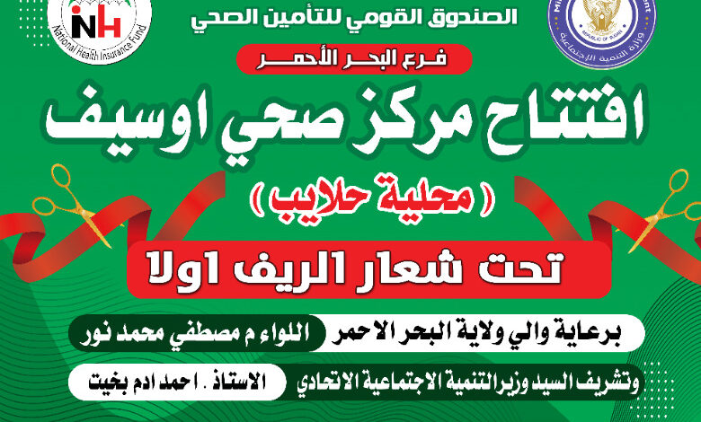 أعلن مدير التأمين الصحي فرع ولاية البحر الأحمر الدكتور علي شاش عن اكتمال الترتيبات لأفتتاح مركز صحي اوسيف بمحلية حلايب يوم الخميس 11يوليو 2024م