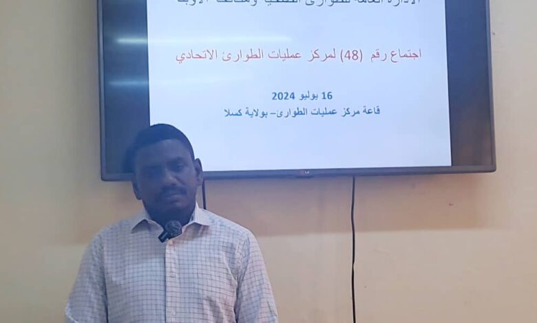 استعرض مركز عمليات الطوارئ الاتحادي في اجتماعه الاسبوعي رقم 48 بقاعة الاجتماعات بمعمل الصحة العامة بمدينة كسلا اليوم، عدد من التقارير لادارات وزارة الصحة الإتحادية والتي شملت تقرير الوضع الوبائي بالبلاد الاسبوع 28 من إدارة الترصد بالإدارة العامة للطوارئ الصحية ومكافحة الاوبئة والذي أكد استقرار نسبي للأوضاع الصحية، وعدم تسجيل إصابات جديدة بالكوليرا للاسبوع السادس على التوالي، ليكون جملة تراكمي الإصابات 11327 إصابة، فيما تراكمي حالات الوفاة 36حالة، وكذلك عدم تسجيل إصابات جديدة بالسحائي ليبقى التراكمي في 136 إصابة ، منها 14حالة وفاة،في حين انخفضت الاصابات المسجلة بحمى الضنك بتسجيل 6 إصابات جديدة فقط،وكلها بولاية الخرطوم، ليصبح التراكمي 9464إصابة من 12 ولاية و75 حالة وفاة تراكميا،