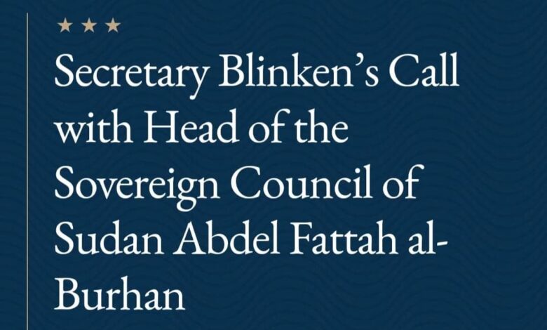 أعلنت الخارجية الأميركية، أن وزيرها أنتوني بلينكن، أجرى اتصالاً هاتفياً اليوم مع رئيس مجلس السيادة السوداني، عبد الفتاح البرهان. في إشارة لاعتراف واشنطن بصفته رئيسا لمجلس السيادة.
