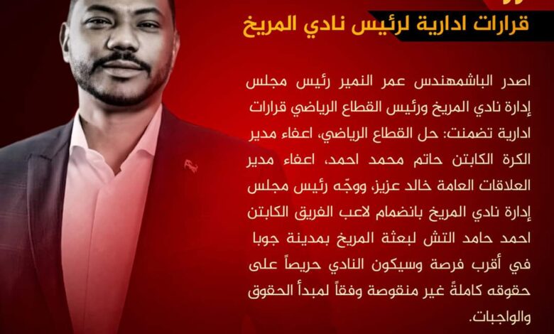 اصدر الباشمهندس عمر النمير رئيس مجلس إدارة نادي المريخ ورئيس القطاع الرياضي قراراً قضى بحل القطاع الرياضي،و إعفاء مدير الكرة الكابتن حاتم محمد احمد، ومدير العلاقات العامة خالد عزيز، ووجّه رئيس مجلس إدارة نادي المريخ بإنضمام لاعب الفريق الكابتن احمد حامد التش لبِعثة المريخ بمدينة جوبا في أقرب فرصة وسيكون النادي حريصاً على حقوقه كاملةً غير منقوصة وفقاً لمبدأ الحقوق والواجبات.