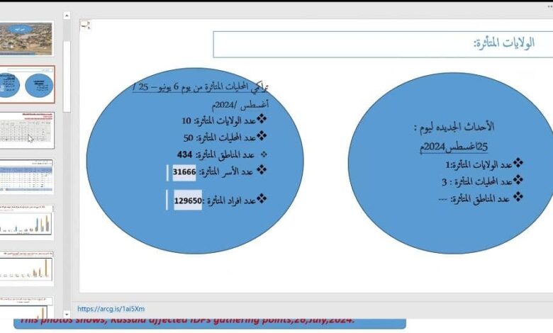 وكشف تقرير الخريف، حتى أمس 25 اغسطس الجاري، إن تراكمي الولايات المتأثرة 10 ولايات، ومنها 50محلية موزعة على 434منطقة،فيما ارتفع عدد الأسر المتضررة إلى 31،666اسرة والافراد 129،650فردا،والمنازل المنهارة كليا 12،420منزلا،وجزئيا 11،472منزلا،في حين بلغ مجمل حالات الوفاة 132حالة، لافتا إلى أن معظم الأضرار بالشمالية ونهر النيل.