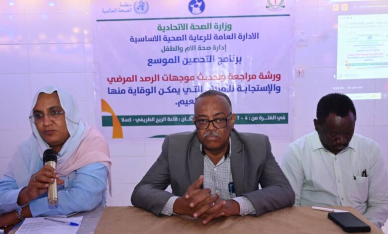 نظمت وزارة الصحة الإتحادية ممثلة في الإدارة العامة للرعاية الصحية الأساسية -برنامج التحصين الموسع-ورشة (مراجعة وتحديث موجهات الرصد المرضي والاستجابة للأمراض التي يمكن الوقاية منها بالتطعيم)، بقاعة الريح الطريفي بمدينة كسلا، على ان تختتم السبت القادم.