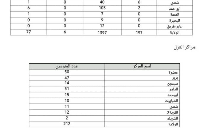 اعلاها كانت في محلية بربر 71 حالة تليها محلية عطبرة 62 حالة ثم محلية الدامر 56 حالة و6 حالات بمحلية شندي وحالتين بمحلية ابوحمد وبلغ عدد المنومين في مراكز العزل 212 حالة