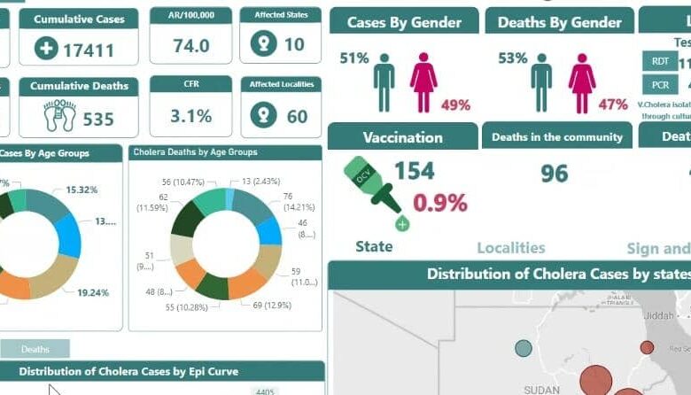 واشار تقرير صحة البيئة والرقابة على الأغذية، إلى المخزون المتوفر من الكلور والكميات المستهلكة، والحاجة منه، منوها إلى تنفيذ تدخلات وأنشطة في المحاور المختلفة لمجابهة وباء الكوليرا بعدد من الولايات.