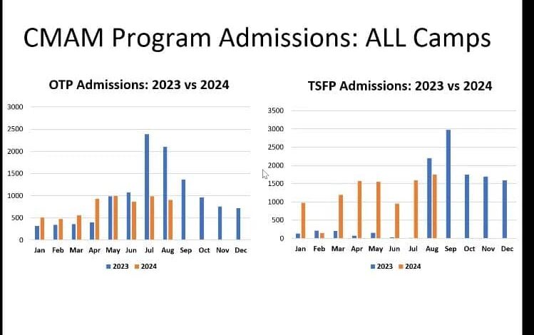 وقطع تقرير برنامج التغذية القومي، بتنفيذ تدخلات داخل معسكرات النازحين في الولايات القضارف، النيل الابيض، كسلا، شرق دارفور، شمال دارفور، والنيل الازرق بالتعاون مع صندوق الأمم المتحدة للسكان، عبر تقديم خدمات المعالجة الخارجية لسوء التغذية،و معالجة سوء التغذية المتوسط من خلال توفير الألبان و الأغذية العلاجية في مراكز تقديم الخدمة داخل المعسكرات، مؤكدا تحويل حالات سوء التغذية الحاد المصحوب بمضاعفات إلى أقرب مستشفى يقدم الخدمة، لافتا إلى توزيع الطعام العام بنسبة (50 %) للنازحين الموجودين بالمعسكرات بدعم من برنامج الغذاء العالمي.