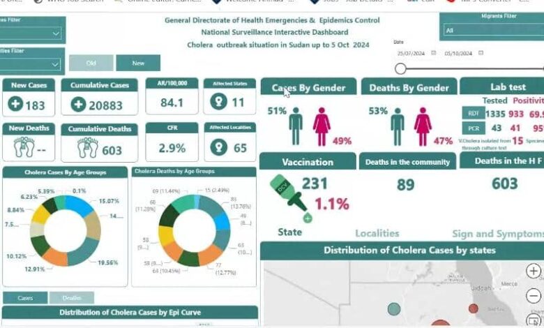 عقد مركز عمليات الطوارئ الاتحادي اجتماعه الراتب اليوم الأحد بقاعة الطوارئ بمعمل الصحة العامة بمدينة كسلا ،واكد تقرير الوضع الوبائي للكوليرا بالبلاد، تسجيل 183 إصابة جديدة أمس السبت 5 اكتوبر من 4 ولايات والتي شملت كسلا، نهر النيل، البحر الأحمر والقضارف، ودون وقوع حالات وفاة جديدة، ليرتفع تراكمي الإصابات من 65محلية في 11 ولاية إلى 20،883 إصابة، ومنها 603حالة وفاة.