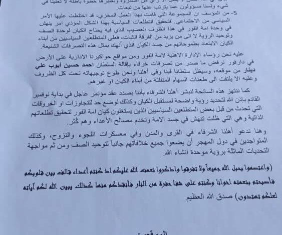 ونتأسف لأن يصل الأمر ببعض أبناء الكيان الاقدام على فتح بلاغات في مواجهة السلطان كيداً له بهدف تلطيخ سمعته ليكون ذلك سنداً لتمرير اجندتهم.