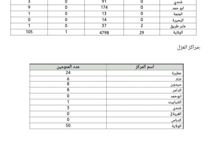 اعلاها كانت في محلية عطبرة 17 حالة تليها محلية الدامر 7 حالات ثم محلية بربر 3 حالات و 3 حالات عابر طريق وحالة وفاة واحدة وبلغ عدد المنومين في مراكز العزل 50 حالة.