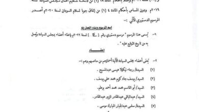 أصدر رئيس مجلس السيادة الإنتقالي الفريق أول ركن عبد الفتاح البرهان مرسوما دستوريا بإعفاء (5) أعضاء مجلس السيادة المدنيين. وهم…